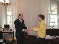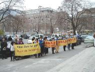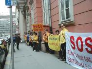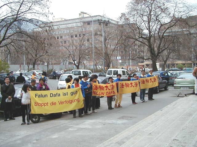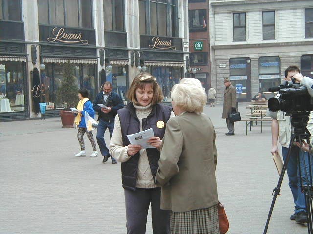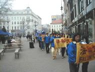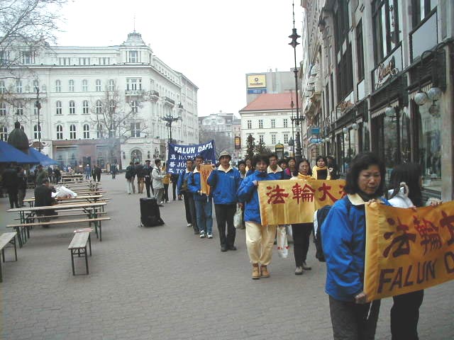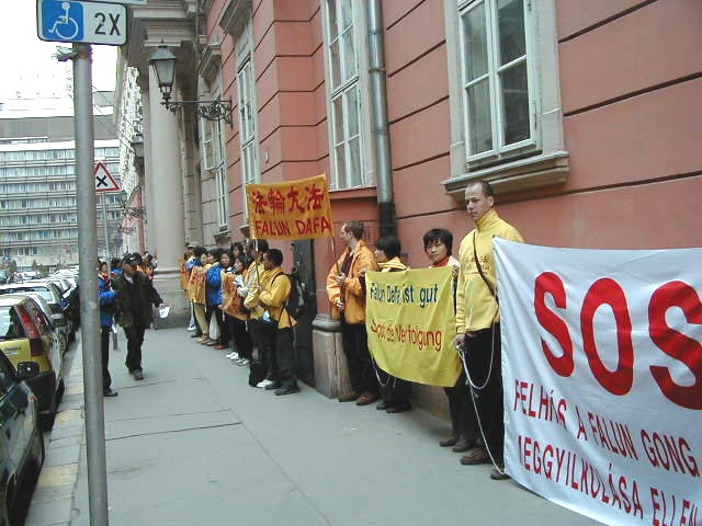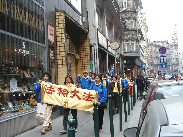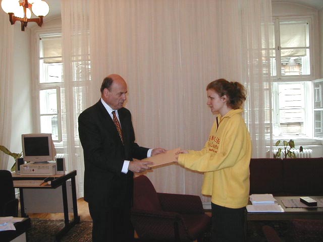 当时TV2电视台的摄制组正巧在场为晚间18点30分的新闻节目采景。另外三家报纸的记者也在场。虽然他们只是碰巧在场,却都对法轮功产生浓厚的兴趣。大约11点半我们开始了游行,第一站是市政府。Szilvia Akbar女士到市政府拜访了市长助理,他很坦诚。Akbar女士事后说,会谈效果很好。下一站是电视台MTV。Akbar女士又和Schrott先生(F.D.V.OE)一齐将关于法轮功在中国受迫害的资料交给了电视台。接下去游行队伍到达议会。议会大厦的建筑十分气派。那里碰巧又有新闻工作者在场。他们拍摄了我们发正念的场景。我们游行的最后一站是外交部。Akbar女士和Schrott先生与外交部内的一位代表进行了交谈,并向他递交了呼吁书及有关法轮功学员在中国受迫害的资料。