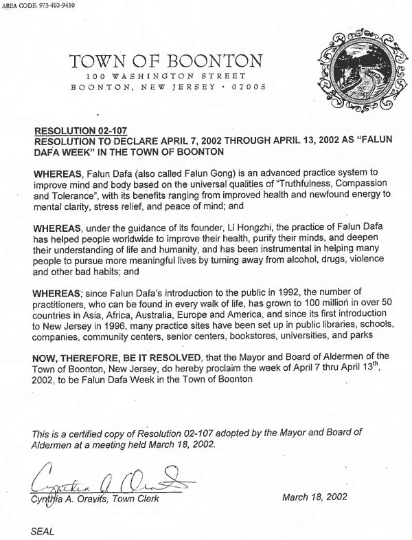 因此,现通过决议,新泽西州布顿市市长和市议会议员以此方式宣布2002年4月7日至13日为布顿市“法轮大法周”。
