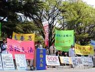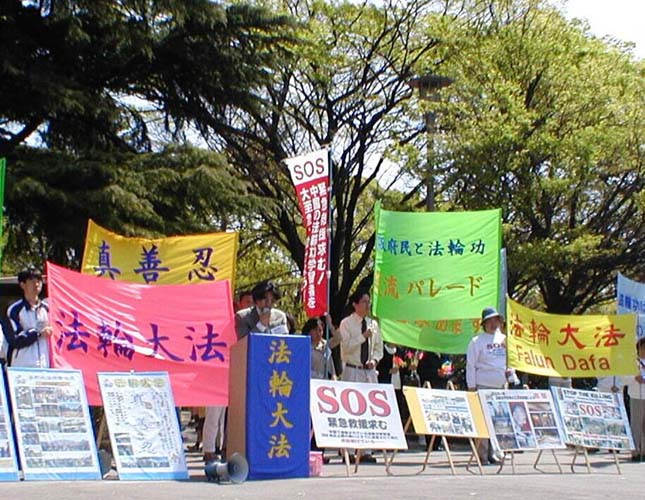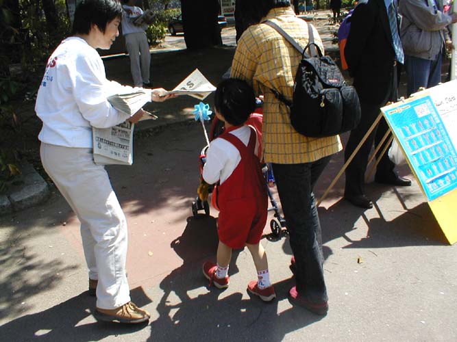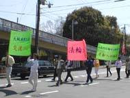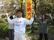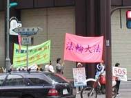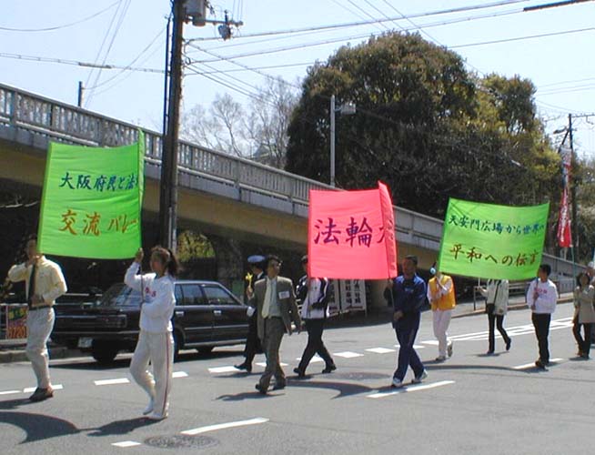 这次大阪的游行是在星期五举行的,学员们克服工作上的困难,积极参加。在游行的过程中,午休的很多政府工作人员和公司职员都主动向我们索取材料,站在路边认真地看。在神户的中华街附近遇到了很多中国人,他们都非常希望了解法轮功,把各种中文材料各要一套才满意地离开。