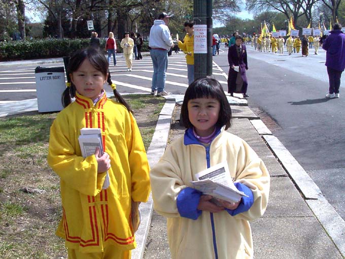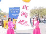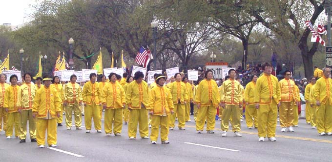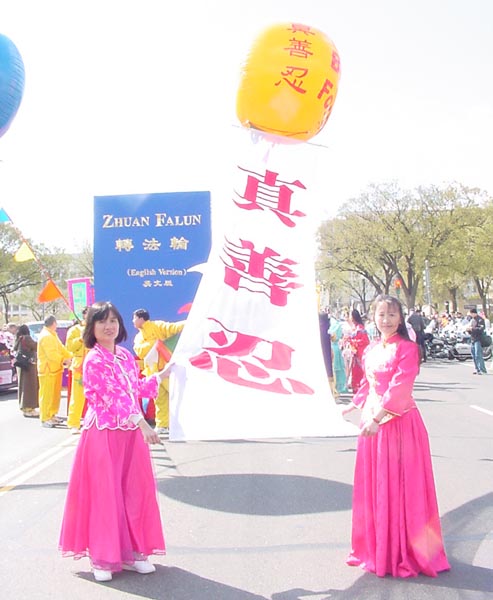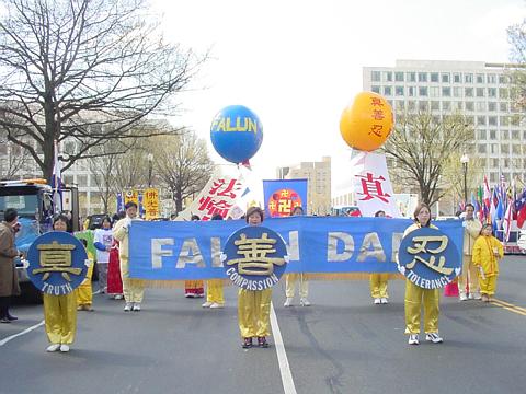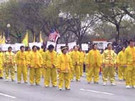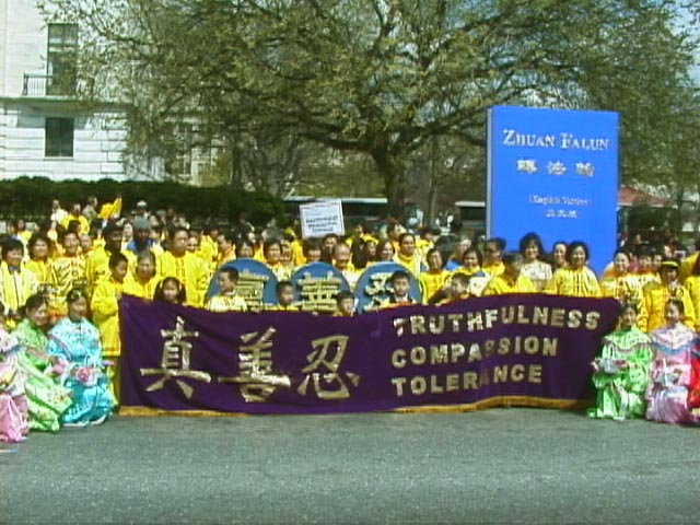 从上午8点左右开始,六、七十支游行队伍、数千人在美国国会山庄前的大草坪上集会,整列队伍。法轮功学员也纷纷搭好了花车、竖起了横幅,格外醒目。游行中,学员们随着优美的炼功音乐,边走边演示着动作舒展协调的功法,赢得了一路上数万观众的掌声。与往年不同的是,这次的游行增添了不少文化特色:来自加州的由学员自发组成的舞蹈队身着粉色衣裙,随着普度音乐翩翩起舞,格外引人注目,所到之处掌声不断。数十块用各国文字写着“真善忍”的小展板向世人展示了大法在世界几十个国家的洪传。一些女学员身着色彩缤纷的中国传统服装,韩裔、印度裔学员身着本国民族服装,吸引了众多观众争相要求合影并主动询问有关法轮功的情况、索要资料。队伍中更有舞龙表演,为人们带来喜庆和欢悦。学员们祥和的问候与慈悲的笑容,浸沁着人们的心灵,给人们带来了“佛光普照,礼义圆明”的震撼。观众们纷纷伸出大拇指:“你们真美好!”队伍行经主席台,主持人热情、全面地介绍了法轮功,观众们再次报以热烈的掌声。