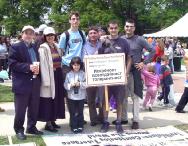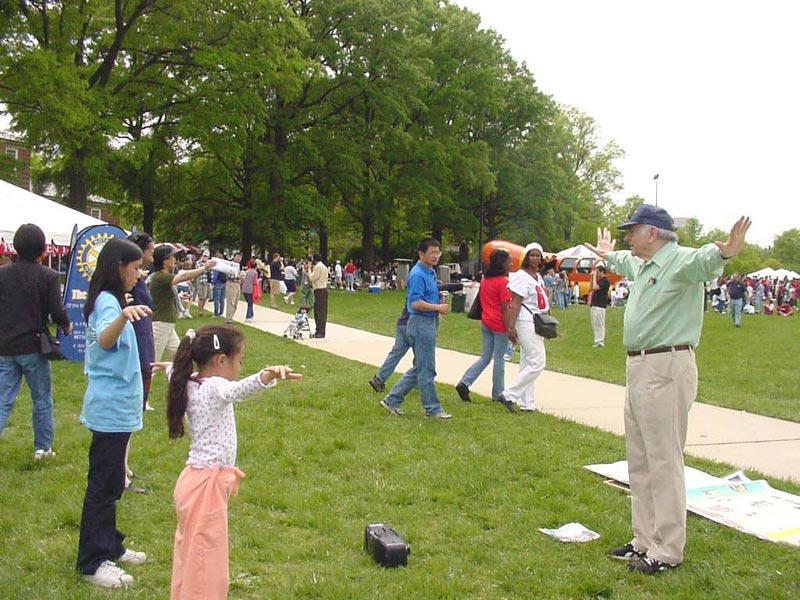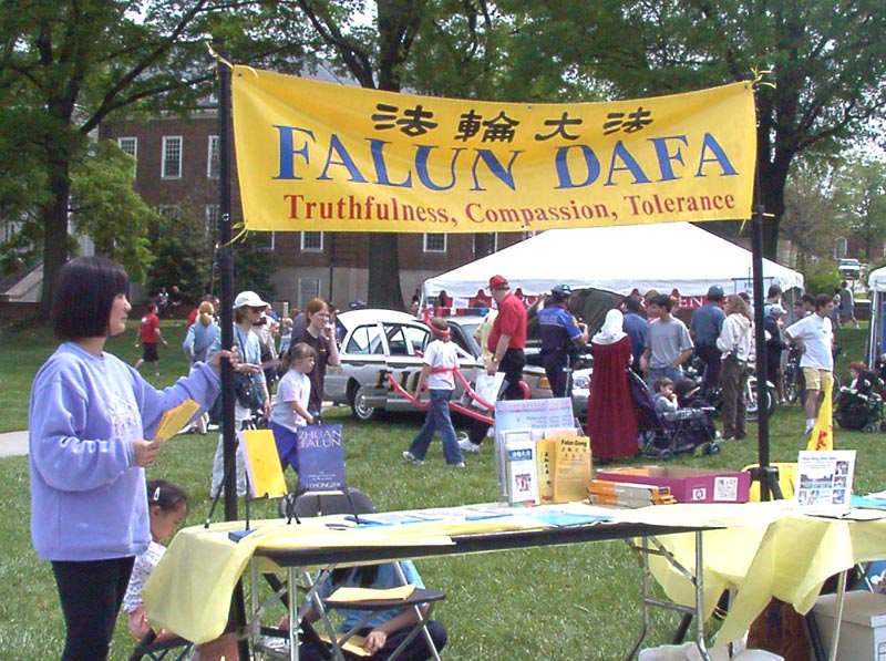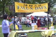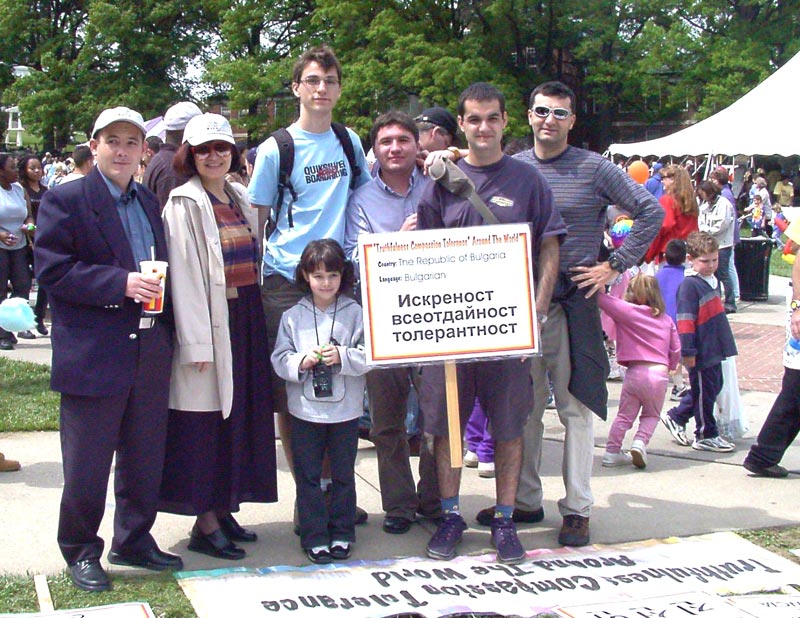 法轮功的展位上,大法的书籍和资料整齐地排放在桌上。展台右方地上放了数张大的展板:大法得到世界各地的褒扬,江泽民镇压法轮功的实例。左方是二十多个国家语言‘真善忍’的牌子。在来往参观的众多参观者中,大都知道大法好,对镇压法轮功的情况非常反对。许多来自中国的同胞也很愿意接受大法的资料,还有些特别走过来索取。有一位华侨还要求看一下《转法轮》。有一大家子人很专心地在看‘真善忍’的牌子,学员过去洪法,得知他们从保加利亚来,交流后请他们拿着保加利亚“真善忍”的牌子照张像,他们欣然同意(见图)。还有一位美国老先生,在我们的展位前看得仔细,几乎收集了所有的大法资料还是不愿意离去,学员和他说,“既然你还在这儿,我想你就应该学一下法轮功功法。”他高兴的问:“什么时候可以学?”我们说:“现在。”于是学员带着小弟子给他做了整套功法的示范,前四套功法他都跟得上而且姿式算得上准确。学完后他非常的喜欢,学员答应尽快给他寄一份师父的教功录像带。他离开前告诉学员说:“我很喜欢你的笑容。”学员说:“因为修炼了法轮功后,我天天都由心底感到开心。”