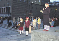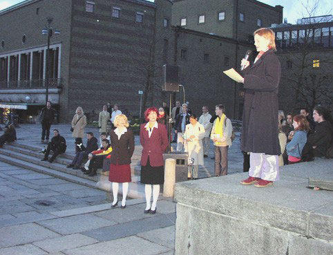 在第二个舞蹈结束后,扩音器中传出节目主持人朗读下一个舞蹈演员的一段话。