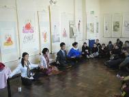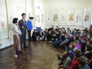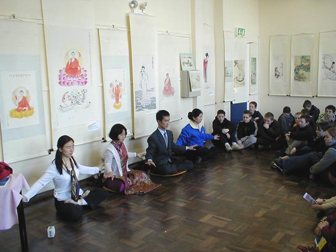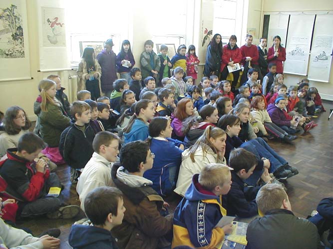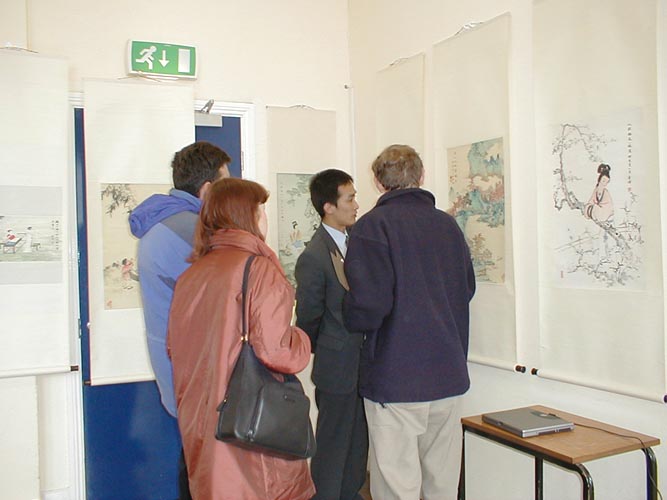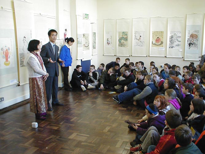 4月30日,章女士来爱的第二场个人画展于当天上午10:00左右在Cork城市大学内举行。第一批观众是一群当地的小学生,这是他们第一次看到中国的传统艺术。章女士精湛的画艺和大法弟子祥和慈悲的场使孩子们表现出从内心的欢喜和雀跃,他们兴致盎然地、仔细地观看每一幅画。很多孩子都表示非常喜欢《主佛》这幅画,他们饶有兴致地听着大法弟子和章女士的讲解。在现场弟子们为孩子们演示了功法。章女士给孩子们介绍了中国传统绘画和她个人因为修炼法轮功在中国被迫害的经历,大法弟子赵明为孩子们介绍了艺术家创作和道德之间的关系,以及作为修炼人修炼和提高心性的意义。