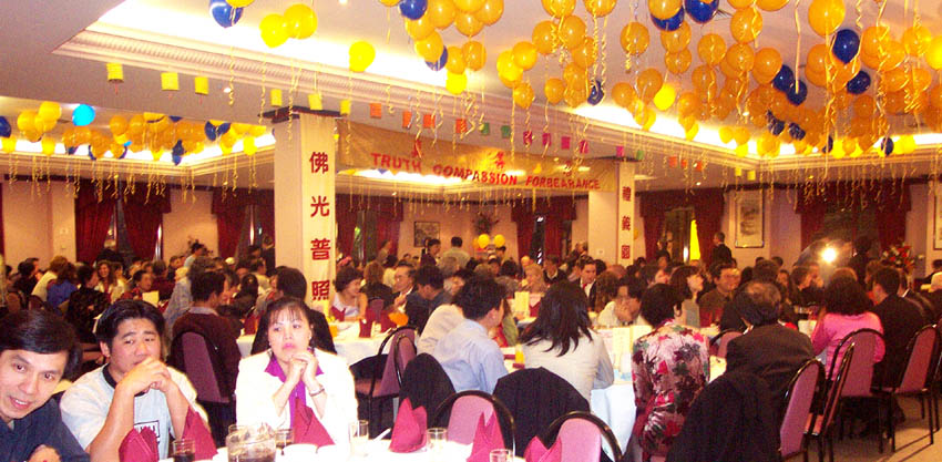 宴会厅的入口处,一排“正法之路”图片向来宾展示了10年来法轮大法洪传世界50余个国家的概况以及中国法轮功修炼者不畏邪恶、大善大忍的胸怀。鲜花、黄蓝两色的气球将宴会厅妆扮得雅致、大方。
