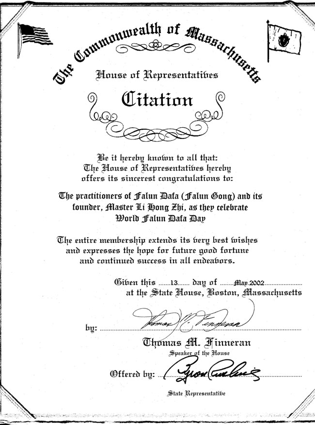 【明慧网2002年5月11日】在法轮大法(法轮功)修炼者和法轮大法创始人李洪志先生欢庆世界法轮大法日之际,马萨诸塞州众议院特此表示衷心的祝贺。