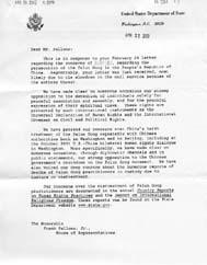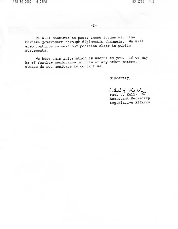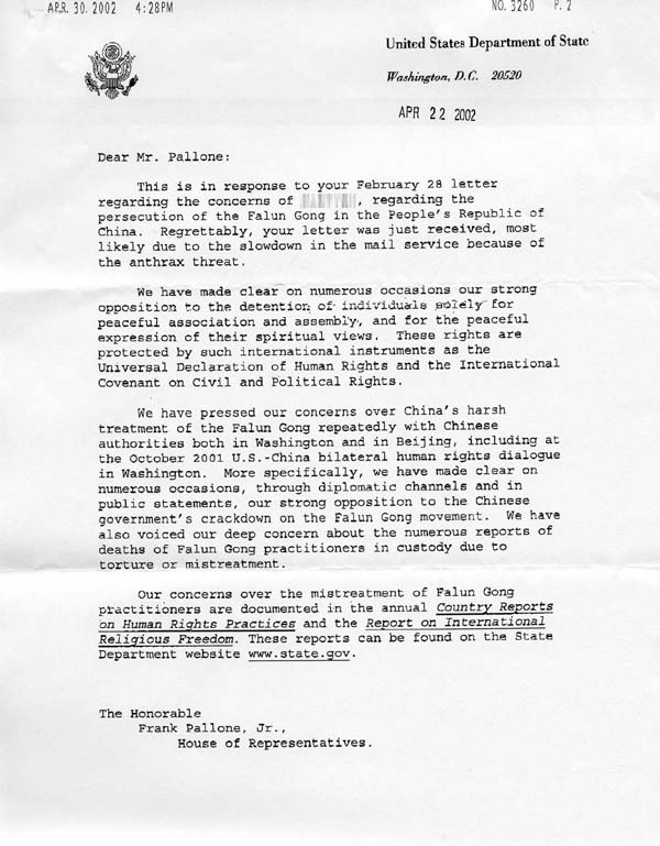 此信是回复您2月28日的来信,有关某女士的情况以及法轮功在中华人民共和国遭受的迫害。很抱歉刚收到您的来信,极有可能是由于炭疽菌的威胁而使信件在邮政机构被耽搁。