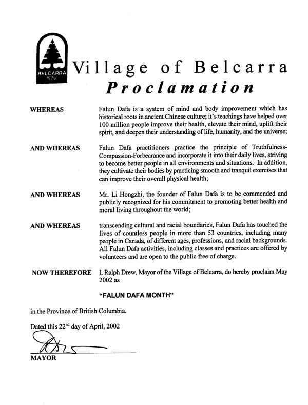 鉴此,我,贝尔卡拉镇(Belcarra)市长拉夫.卓(Ralph Drew),宣布2002年5月为不列颠哥伦比亚省(BC)贝尔卡拉镇