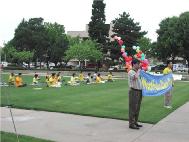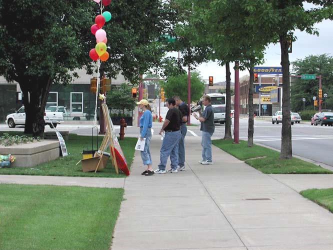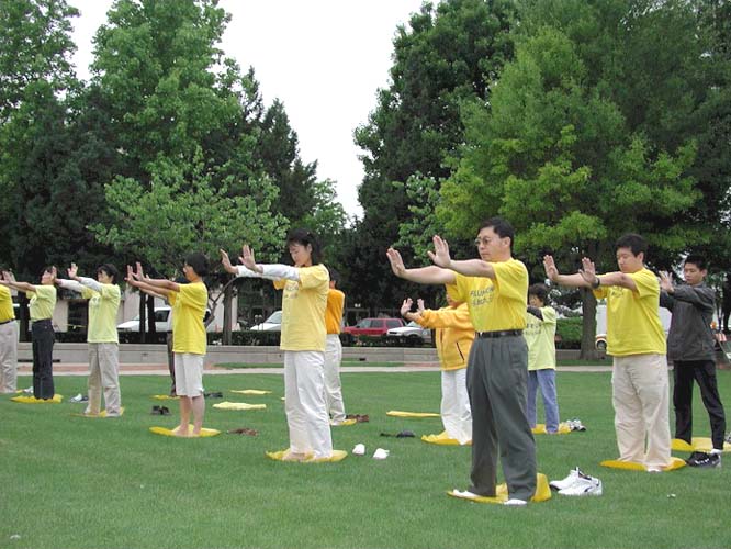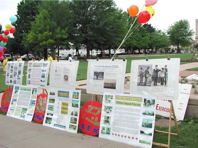 奥克拉荷马市的一位西方学员组织了这次活动,做了大量的工作,联系媒体、并申请到面对政府大楼前的活动的许可,德克萨斯州达拉斯,拉伯克,及阿肯色州的大法弟子也长途驱车来参加这一活动。学员们在这里炼功、发正念、向过往的路人发资料、讲真象,使得人们有机会闻到佛法。