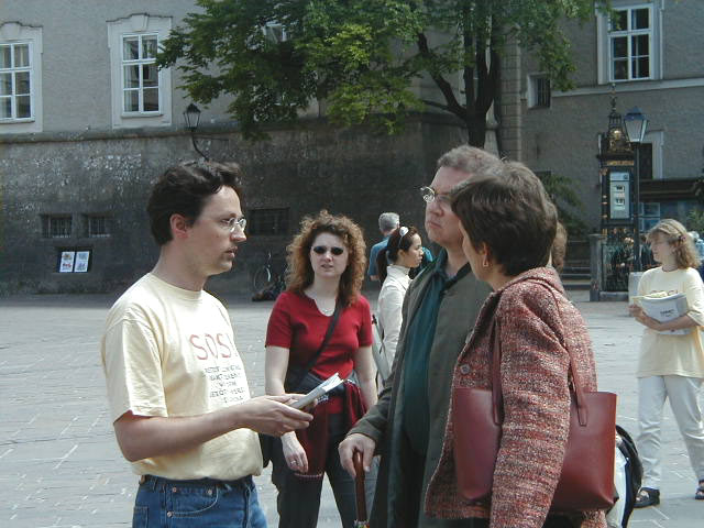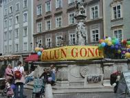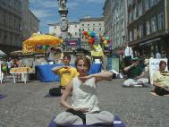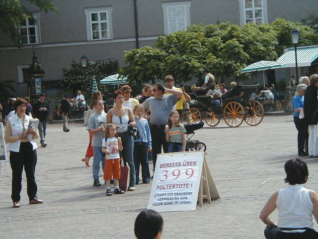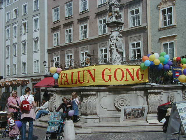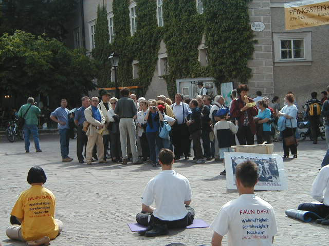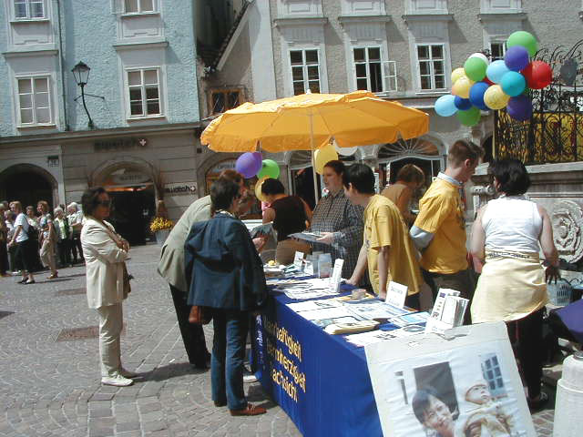 优美的大法音乐,舒展的功法表演,深深吸引着过往的行人与各国游客。四周点缀的彩色气球,更添欢庆的气氛。许多人在展台前索要大法音乐、信息资料,签署帮助在中国的修炼者的呼吁信。萨尔茨堡是奥地利的旅游胜地,许多中国游客在此停留。大法弟子主动向他们讲清在中国对法轮功修炼者迫害的真相,耐心地回答他们的疑问。有的华人游客鼓励弟子们继续努力,他们相信中国的镇压在善良人们的努力之下会发生改变。