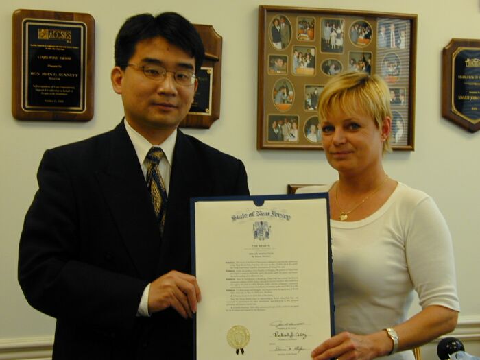 鉴于,法轮大法自十年前公开传出以来,已经触及了新泽西州无数居民的生活,在全州各地的图书馆、学校、公司、社区中心、老年中心、书店、大学、公园及基督教青年会(YMCA)等处都设有固定的炼功点;并且