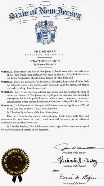 鉴于,新泽西州参议院高兴地注意到第三个“世界法轮大法日”庆祝活动将于2002年5月13日举行,同时,该日也是法轮大法洪传世界十周年纪念日;并且