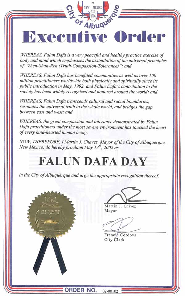 【明慧网2002年5月13日】美国新墨西哥州阿尔伯魁市宣布2002年5月13日为“法轮大法日”。