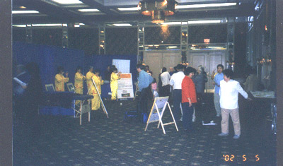 在联系参展时,学员原来只预定了一个展位,后来当博览会的组织者听说我们愿意做功法演示和义务教功,当即决定除我们已定好的展位外,要提供一个免费的展位给我们。当学员来到展厅布置展位时,博览会的组织者索性将这个免费展位旁边的一个空展位又送给我们。这两个紧挨在一起的展位虽然位于展厅的侧面,却是整个展厅里最佳的洪法位置,真可谓得天独厚:不仅宽敞,实际可利用的空间相当于一个标准展位的五到六倍,而且丝毫不影响到别人的展位。一切似乎原本就是为大法而设而安排好的。