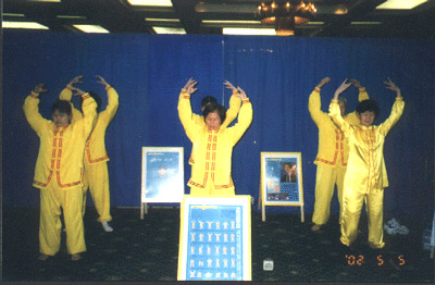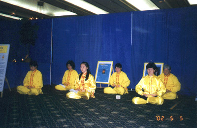 就这样,从早上10点博览会开始到下午4点结束,学员们持续不断地轮流进行功法演示:整齐鲜艳的黄底红边练功服,宁静柔和的大法音乐,优美平和的功法演示在整个博览会大厅里构成了一道独特的风景线。其他学员则在宽敞的展位前面义务教功,或在第三个展位前用电视和传单向过往的有缘人传递大法真相和信息。天象也许真到了这一步了:川流不息的人流一批一批地为大法祥和慈悲的能量场所吸引,几乎每一个经过的人,不论是他们的肤色是黄是白是黑,是老是少,是男是女,都在我们的展位前驻步停留。不少人情不自禁地跟着学员学起了功。展位里的学员认真地一遍接着一遍演示五套功法,展位前的功友耐心细致几乎是一刻不停地教功。特别是一位年纪大的功友,我们叫她李阿姨,她那颗为生命的未来着想的纯善的慈悲心使得她用最简单的英语掺和着中文,也能自如地与有缘人交流并教功。