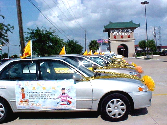 于五月十二日下午两点半至五点半,休士顿大法弟子的十几辆洪法汽车开始出发,环绕休士顿最繁华的街道和中国城,这些汽车上悬挂写有“法轮大法”和有彩色炼功照片的横幅,装饰着花朵和金条带等,特别醒目。引起了市民的瞩目。