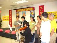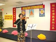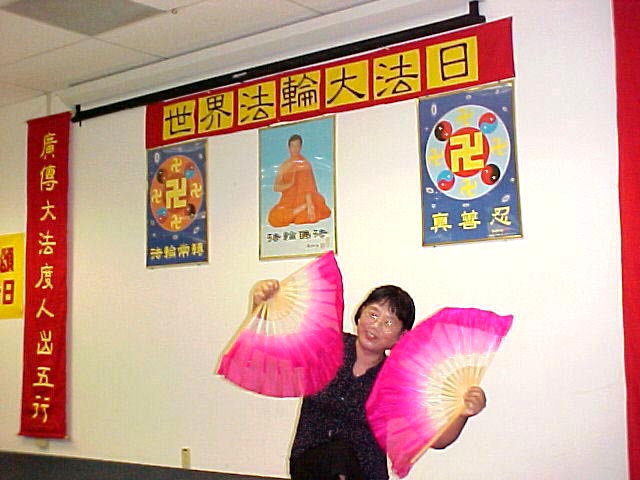 五月十一日晚上七点半至十点,在中华文化学院大礼堂举行庆祝晚会,首先,全体大法弟子双手合十感谢师尊传法救度众生。然后表演了各种节目。尤其是阿灵顿城的两位同修,在酷热下开车五个多小时,赶来参加庆祝晚会,阿灵顿的丽莎女士,是拥有几十年经验的专业小提琴艺术家,她那精湛的指法,她那对大法的敬仰,全部融入演奏的大法弟子创作的歌曲中,获得一片掌声。在这殊胜而欢乐的夜晚,一位西方弟子用中文演唱“法轮大法好”;另一位中老年弟子在“普度”曲中持舞扇欢快起舞,台下的一位弟子对她还未得法的母亲说:“你看,修炼法轮功以后大不一样,这哪像退休的年龄,红光满面,充满青春活力。”