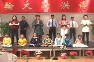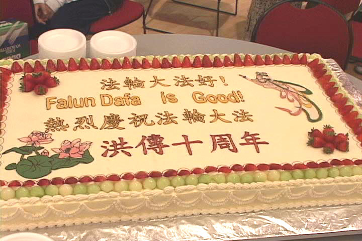 法轮功学员们自制的佳肴和自编自演的文艺节目为晚宴增添了色彩,西雅图弟子也赶来助兴,为晚会表演了古筝独奏、小合唱,与特邀嘉宾作古筝琵琶二重奏。温哥华弟子还表演了小品“真相”、男声合唱、小弟子合唱、中外女声小合唱,功法演示。所有表演赢得了阵阵掌声。庆祝大法洪传十周年的大蛋糕为晚宴带来了又一高潮,晚宴在齐唱“法轮大法好”中结束。整个晚宴神圣祥和,大法的美好给所有宾客留下了深刻的印象。