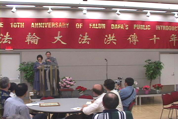 200多人参加的晚宴上宣读了温哥华市“法轮大法月”的褒奖和满地可市市长的褒奖。加拿大医院工会主席福瑞德.姆津(Fred Muzin)先生、前任BC省人权委员会主任委员玛丽.伍.西姆斯(Mary-Woo Sims)女士、满地可市长代表伯特.图洛克(Bert Tulloch)先生和国际特赦组织列治文市代表麦克.古根(Mac Gugan)女士出席了晚宴并作了发言。玛丽.伍.西姆斯女士在讲话中盛赞真善忍宇宙最高法则,盛赞大法弟子在两年的迫害中勇敢捍卫真理的精神。中外宾客还共同观看了《和平历程》影片,众生无不升起对大法的崇敬。