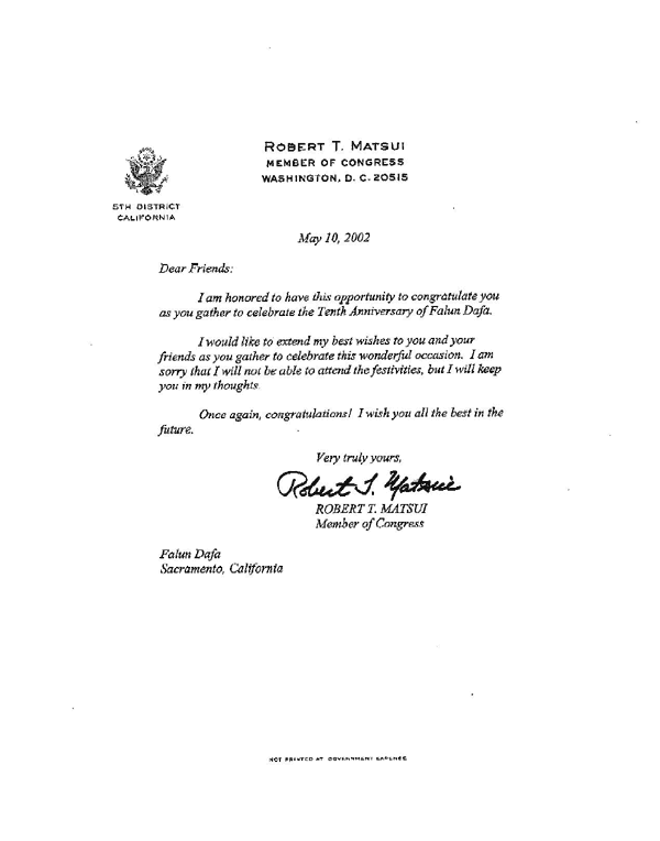 诚挚地,(签名)国会议员罗伯特马特苏(沙加面度地区)