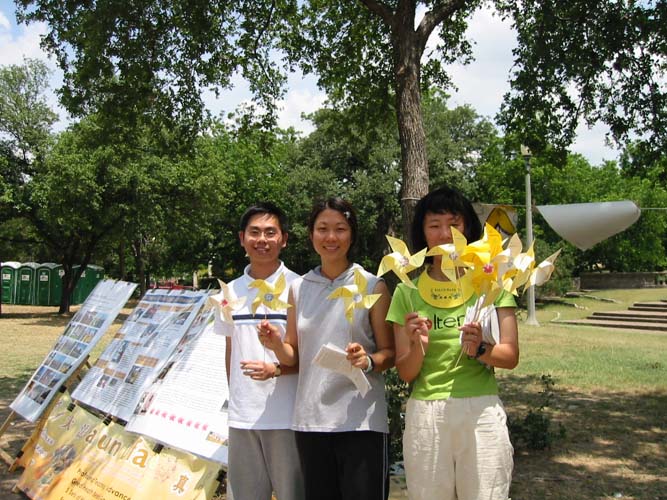 一传十,十传百,孩子们带着他们的小朋友纷纷排着队来领风车,有的全家要和学员及图片合影。一个很小的女孩走到图片前要求我们给她一张张,一段段地讲解。孩子们无比惊喜珍爱般地接过风车,稚嫩的声音重复着“真、善、忍”,“法轮大法好”快乐地向前奔去。