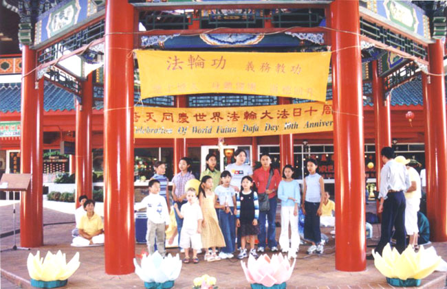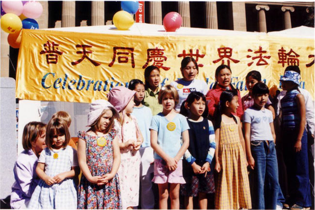 典礼中,十多位西人,华人小弟子为来宾表演了精彩的节目,包括诗朗诵<心自明><大法好>,合唱<法轮大法好><唱给师父的歌>等。全体大法学员随后为来宾表演了法轮功功法。文娱节目在最后全体来宾连续三遍的同声大合唱<法轮大法好>中结束。几乎所有来宾,过路行人都被这纯净祥和的歌声所打动,有的西人还情不自禁的学唱起来。