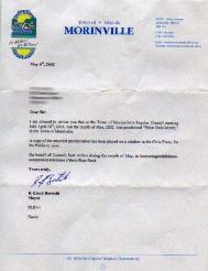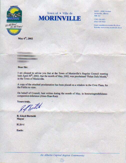 “亲爱的先生,我很高兴地通知您,在2002年4月30日召开的莫林维尔市议会常务会议上我们决定将2002年5月定为莫林维尔市的‘法轮大法月’。