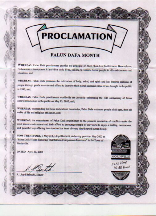 鉴此,我,市长罗伊德.博茨基在此宣布2002年5月为莫林维尔市(Morinville)的“嘉奖真善忍法轮大法月” 。