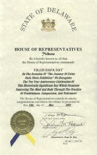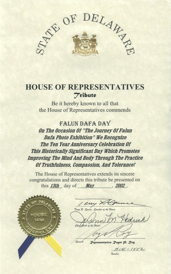 特拉华州众议院致以衷心的祝贺,并定于2002年5月13日颁此表彰令。