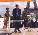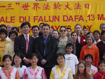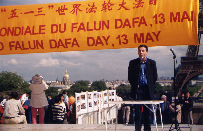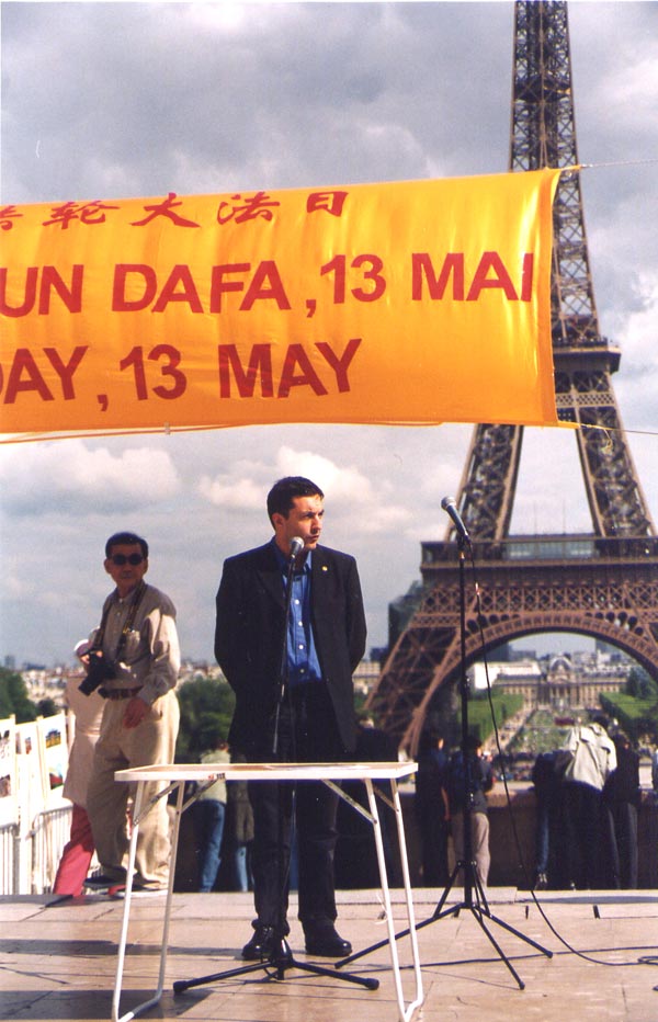 我是法国主张环保的政治党派绿党的亚洲委员会主席。我来这里是向你们正式表示支持,支持你们为你们修炼自由的斗争。当然,这是以(绿党)运动整体及其主要负责人如前总统竞选人诺埃尔·马梅尔(Noel MAMERE)和全国总书记多米尼克·瓦娜(Dominique VOYNET)的名义的正式支持。提醒大家,在中国的人权自由问题上,诺埃尔·马梅尔是极为明确的……我们对法轮功的支持不是从今天才开始的,它比对法轮功的镇压还要强烈。中国(江泽民)独裁体制下的中国政府是最反常的政府之一,因为如果说人们还能理解或是说看到中国政府野蛮镇压争取自治或独立的西藏人的逻辑、野蛮镇压同样争取自治或独立的维吾尔族人的逻辑。但人们难以理解那些促使一个政府自称合法地对八千万到一亿根本不要求任何自治、任何独立、也不要求领土、仅仅要求能够早晨或下午炼炼能使他们身心平衡的功法的人进行镇压的动机。