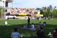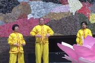 在大法弟子们的精心布置下,偌大的舞台显得壮观、殊胜。印有中英文“法轮大法”和“真善忍”字样的横幅,与舞台中央美丽的水红色莲花交相辉映。悠扬悦耳的“普度”乐曲声,使整个场景洋溢着大法的慈悲与祥和,让这里熙熙攘攘的过往游人耳目一新,流连忘返。