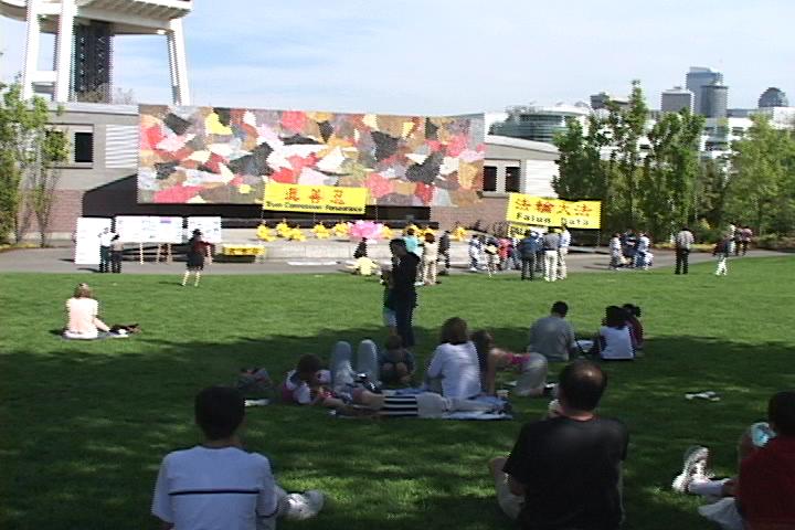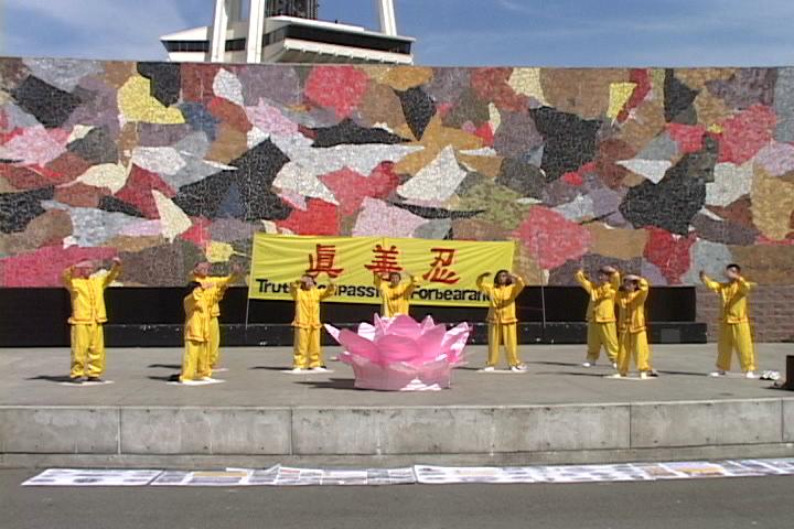 周日又适逢纪念法轮大法洪传世界十周年,庆祝世界法轮大法日。当天,春光明媚,晴空万里,位于西雅图中心的著名景点太空针,游人如潮,熙熙攘攘。西雅图地区的大法弟子们和其他远道而来的其他西北地区的同修们来到这里,欢度普天同庆的法轮大法日和大法洪传十周年。他们在露天舞台上,演示了舒展优美的五套功法,并展出了各种大法真相图片,向世人洪法讲清真相。