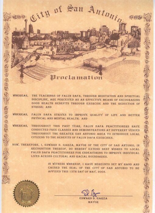 因此,现在,我,圣安东尼奥市市长爱德华-哥尔查,特此表彰本地法轮大法学员们为跨越文化和种族界限、致力于改善个体生活而付出的努力,并在此向他们致以最美好的祝愿。