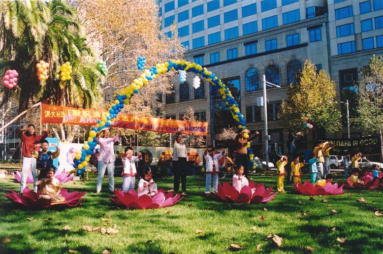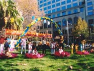 【明慧网2002年5月17日】大法洪传十年,普天同庆,悉尼明慧小学的小弟子们在庆祝会的功法表演别具一格,稚气顽皮的小班及小小班学生坐在莲花盘里打坐犹如婴孩一般可爱。孩子们身着彩色薄纱表演带有芭蕾动作的舞蹈,恰似仙女飞天一般,不同班级孩子们身着民族服装的大合唱更是引人注目,从小得法有佛缘的孩子们演唱了《我是大法小弟子》,场上孩子们嘹亮的歌声赢得了热烈掌声。