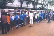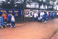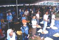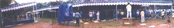 九时左右介绍班开始,广阔的草地上,大布棚下排满了男女老少,三千多名师生参加大会。有些学徒站在遮棚外露天淋雨在学炼功法,大法弟子身穿黄色衣裳,在雨中穿插教功示范。悠扬祥和的法轮功音乐在校园中回响。