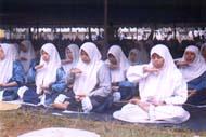 | 印尼文横幅“世界需要真善忍” | 回教徒信女集体学功 |