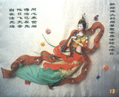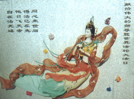 【明慧网2002年5月17日】北京、西班牙大法弟子向伟大的师尊暨世界法轮大法日敬献绢制工艺美术作品“飞天”,并向全世界大法弟子问好!
