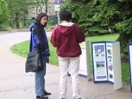 我们的活动快要结束时,一位开车路过的男子停下车来,透过车窗阅读着展板上的文字和图片。这时我们带来的传单已经发完了,我们递给他一张真相光盘,他非常高兴地接过去,并冲我们竖起了大拇指。