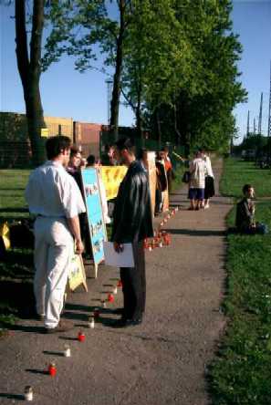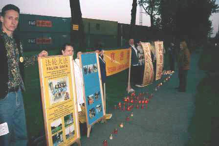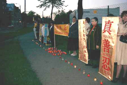 我们身边站了5名警察。他们一人说:“我们应该保护你们。”他们站在那里,换着腿的姿势来休息一下,他们弄不明白,为什么派了他们这么多人在这。他们问我:“你们活动到几点啊?”我告诉他们到晚上10点。我看到,他们脸上露出疑惑的表情,他们很纳闷:为什么派了这么多人又要站那么长时间?我告诉他们,工作日结束后,第2天是休息日,所以很多人晚上出来散步,对他们来说是很好的知道大法真相的机会,他们能有机会知道,为什么极权政策下的中国要镇压法轮功,为什么掩盖真相,知道有这样的人,为了坚持真善忍的信仰付出了自己的生命,让人们了解到,他们也同样有机会来支持大法。我问他们,他们能否只留一个人和对话机为防止中国使馆方面挑拨事端,省得他们5个人一起加班。他们说,这得问他们的长官。他们的上司来了之后,我告诉他,我们在哥德堡的时候,在欧洲国家首脑聚会期间举行过法轮功游行。那时候全市都是骑着马的警察和特种部队为了防止反联盟人员有何突发活动。而派去伴随法轮功游行的只有一辆警车和两名警察,他们告诉我们说:“我们知道,你们都是好人,我们一起去喝咖啡,你们游行结束了就给我们打个电话。” 和我们在一起的警察说到:“是的,我们也看到了,你们是和平友善的人,加油啊!”过了2分钟国家警察局的人走了,只留下了2名市区警察陪伴着我们。