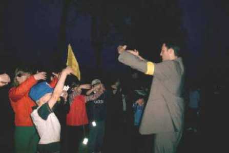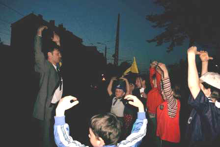 太阳逐渐落下去了,天开始黑了下来。好多人到外面来呼吸新鲜空气。一对夫妇和孩子走上来问我们,我们在做什么。这时候跑来了一群孩子也问同样的问题。我们给他们介绍了展板上有关大法真相的信息。一个同修主动建议教他们功法,这个建议很高兴地被他们接受了。路过的汽车司机用车喇叭来向我们致意,公共汽车的乘客从窗户向我们招手致意。