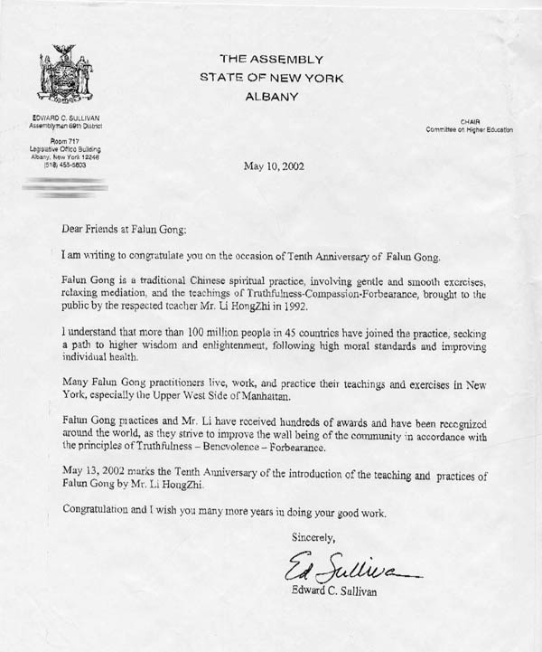 在法轮功传出十周年之际,我写信向你们表示祝贺。