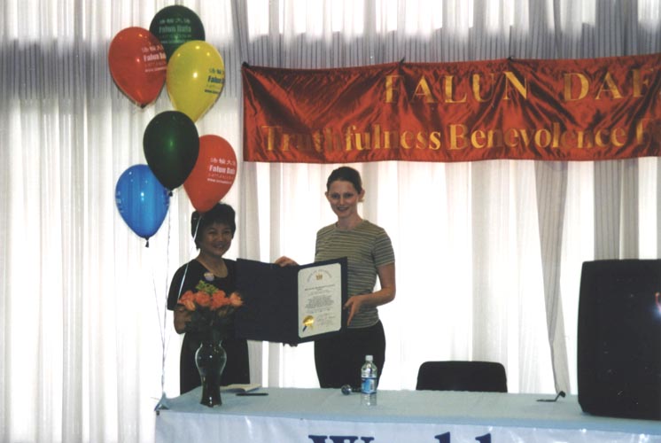 13日上午11时,举行了图片展开展仪式。仪式上宣读了特拉华州州长Ruth Ann Minner对大法日的褒奖。褒奖中写到:“鉴于,在最严峻的境遇中,法轮大法修炼者所展示出的伟大的至善至忍之举,深深感触了我们、国家及世界人民的心灵;我们在此谨宣布2002年5月13日为特拉华州法轮大法日,并鼓励全体特拉华人赞赏并支持第一州及全球的法轮大法修炼者。”州众议院议员Roger P. Roy也派人参加了典礼,并代表他颁发了州众议院签署的表彰令,表达了对大法洪传十年的庆祝和对此次图片展的祝贺。另外,州参议院议员Margaret R. Henry,州众议院议员Richard A. Diliberto, Jr.也都写来热情洋溢的祝贺信。之后,学员作了长约20分钟的“大法历程”讲演,回顾了大法十年的盛传、今日的巨难,以及在巨难中依然傲立的大法弟子们。仪式结束后,播放了录像片“和平之旅”。在场的所有的人都被大法的真善忍精神,和修炼者的正义气概强烈地震撼着。