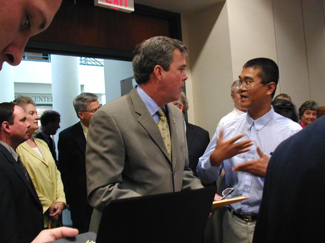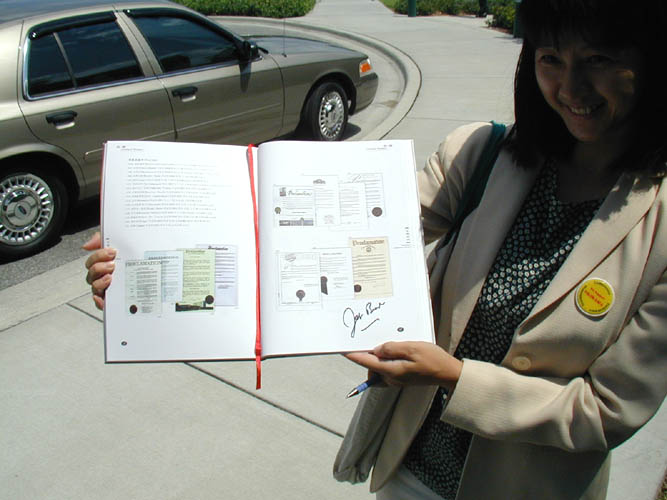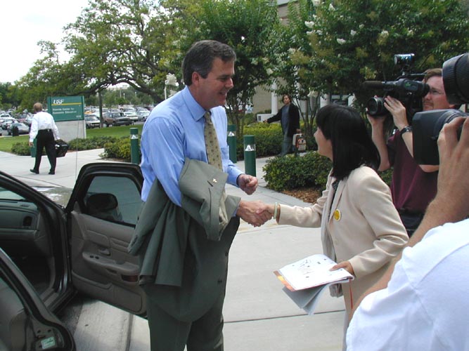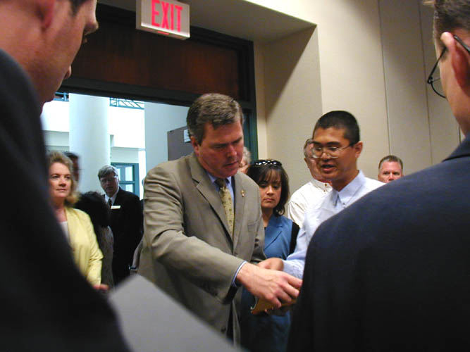 【明慧网2002年5月19日】5月16日上午11点,佛罗里达州新教育法案签字仪式在南佛罗里达大学进行,佛罗里达州州长杰.布什及其他重要政界官员出席了该仪式。坦帕学员抓住机会,面对面向布什州长呼吁帮助停止镇压法轮功。在布什州长入场前,两名学员们选择了很好的位置就座,另一名则站在了入口处。布什州长入场首先就与学员握手,学员极简单的介绍了自己因修炼法轮功而被的情况并要求布什的帮助,布什州长说,“没有问题(ABSOLUTELY)”他亲手接过了学员们准备的资料并保证会了解此事。