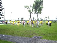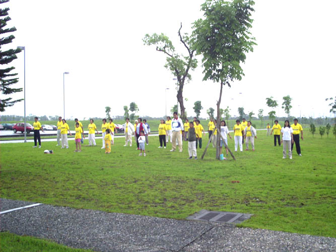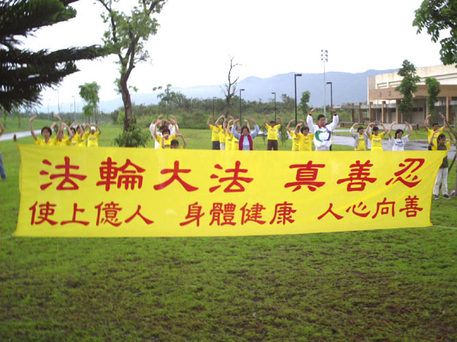 「东华法轮大法周」系列活动,在集体炼功活动中结束。天空飘着微微细雨,花莲和东华的学员们顶着细雨平静地在草坪上演炼五套功法、发正念。