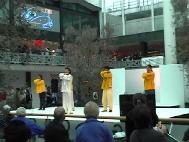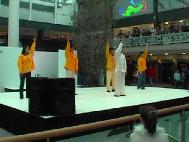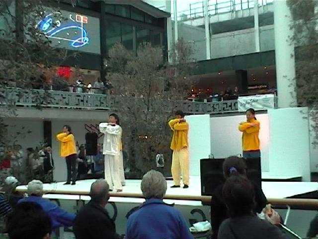 宽敞明亮的商业城内,人头攒动。中间搭建的崭新的表演舞台尤其引人注目,各类表演交替进行。震耳欲聋的现代音乐令现场显得有些嘈杂。然而,当大法弟子一出场,悠远绵长的大法音乐立刻使现场笼罩着一片祥和宁静的氛围。5名大法弟子在音乐的伴奏下,演示了舒缓优美的五套功法。另外一名大法弟子通过麦克风向观众介绍功理及大法在中国正在遭到的迫害。观众们被深深地打动了,10分钟演出结束后,观众席上爆发出热烈的掌声,这是在前面的节目表演中观众所没有的特别的赞许。节目主持人也被深深地感染,一再表示谢意。 1小时后,节目主持人出乎意料地又找到我们,表示应观众的要求,邀请大法弟子再次为观众表演。这是在整台节目表演中唯一的特例。