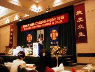 下午法会开始时播放了“普天同庆- 法轮大法洪传十周年”的短片,片中展示大法在世间洪传的场面震撼人心。