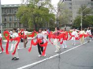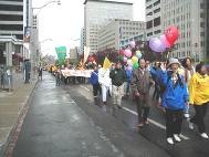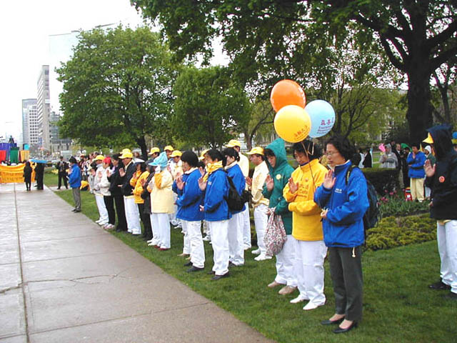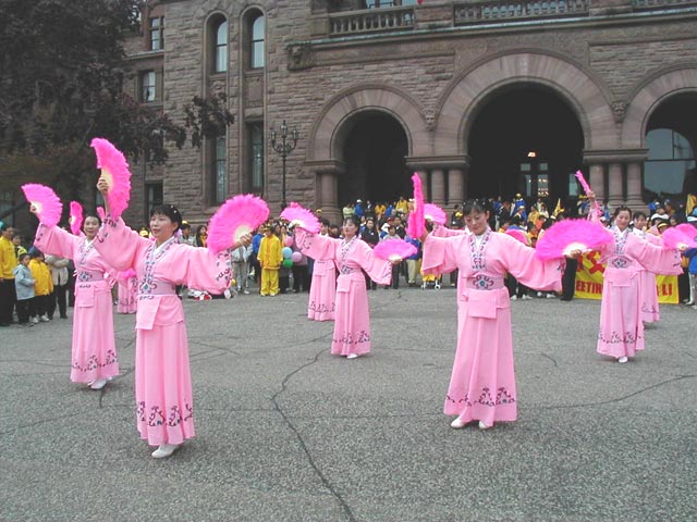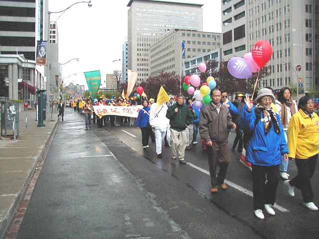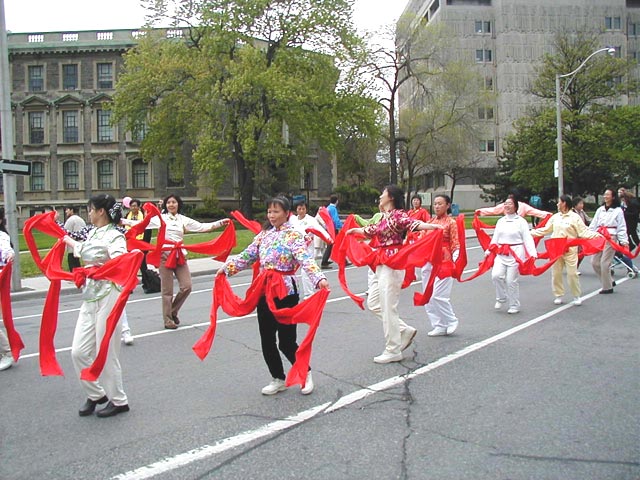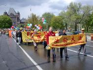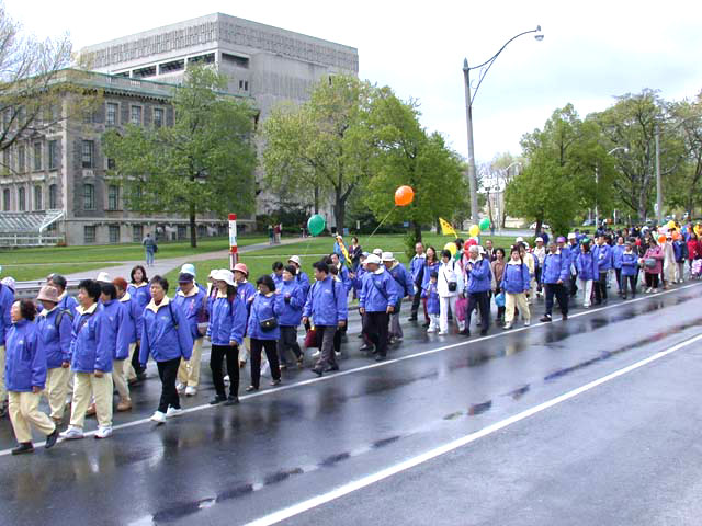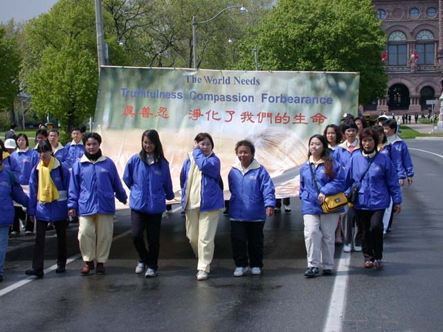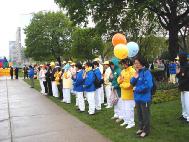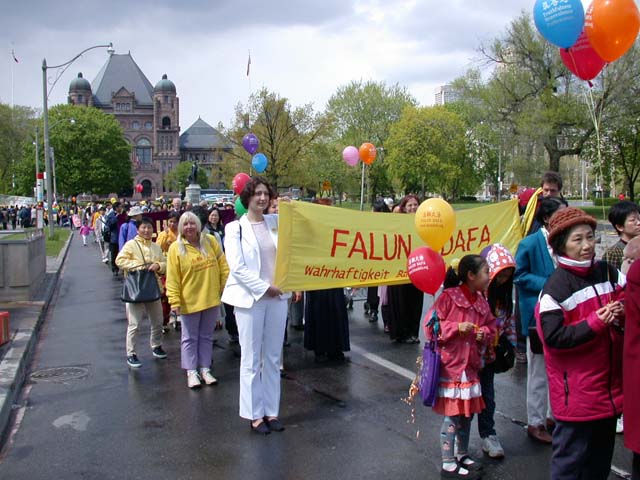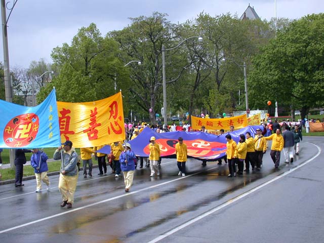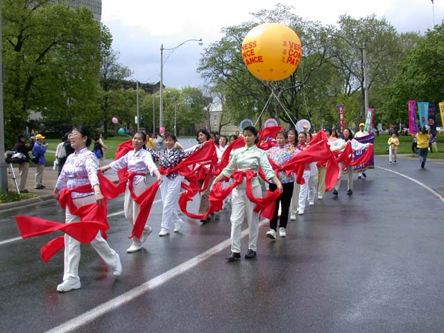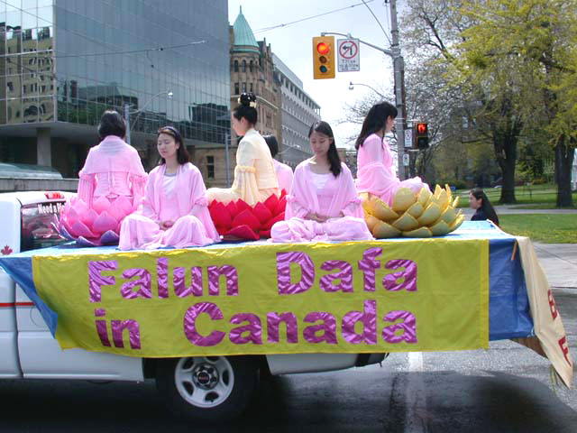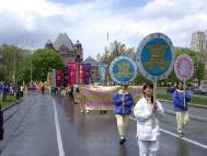 在“法轮大法好”音乐车的引导下,几名东西方大法弟子手持“法轮大法在加拿大”的巨大横幅走在队伍最前列。随后“师父您好”的横幅表达着全世界大法弟子共同的心声。队伍中十几名身着粉红色长裙、手持扇子的女大法弟子在“法轮大法好”的音乐声中翩翩起舞。硕大的氢气球高悬在行进的队伍中,上面用中英文写着“真善忍”“法轮大法好”。