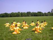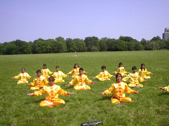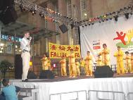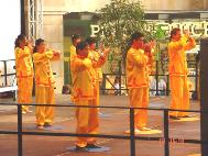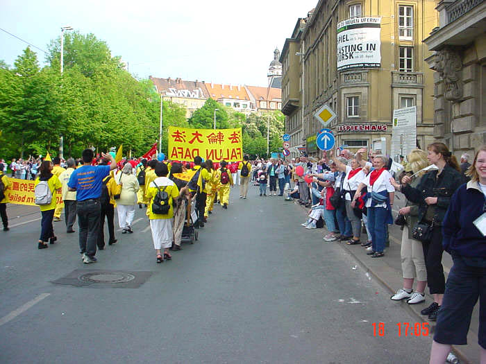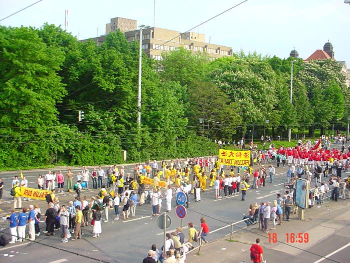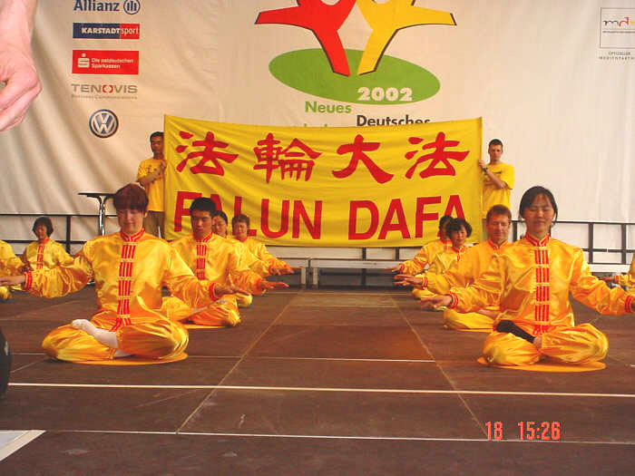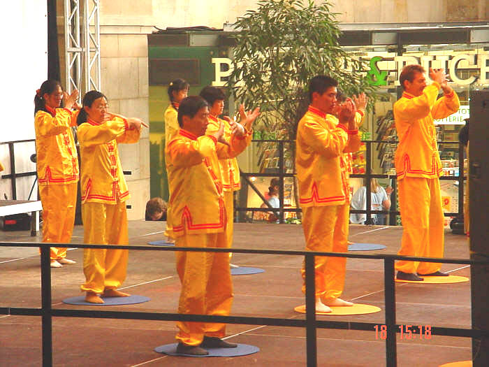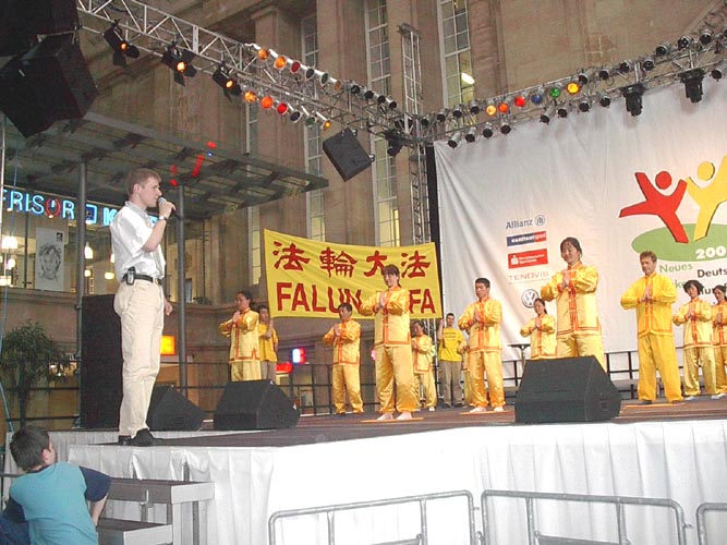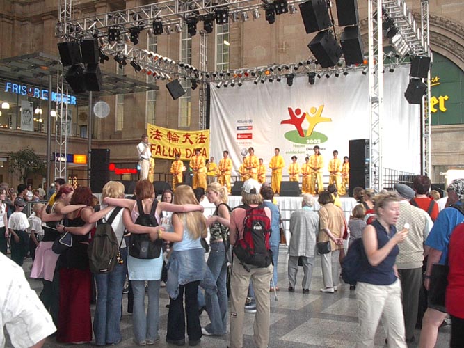 五月十八日的莱比锡,天气晴朗,阳光明媚,参加喜庆活动的人们兴高采烈。在莱比锡火车站(欧洲最大的终端火车站)搭起了一个大舞台,法轮功学员应邀表演了功法,主办者给了我们一个小时时间。十六名来自邻近地区的大法弟子身穿闪烁着节日气氛的黄颜色炼功服,在炼功音乐的伴奏下演示了五套功法,一名西人学员对功法作了详细的讲解。途经此地的人们纷纷为这优美祥和的场面所吸引,久久不愿离去。围观的人越来越多。许多年青人干脆坐在地上,直到我们表演结束。法轮功的表演赢得了热烈的掌声。