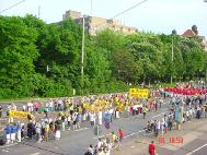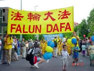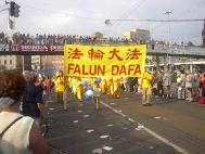 我们也应邀参加了大型的节日游行,围观者人山人海。法轮功所到之处,观众都报以热烈的掌声和欢呼声。写有中德文“法轮大法”的黄色横幅在游行队伍中格外引人注目,人们大老远就欢呼“法轮功”。不断有人用中文向我们打招呼:“你好!”人们纷纷挥手向我们致意,我们则用合十作答。人们很愿意接受大法的报纸和传单。我们在行进中表演了第一和第三套功法,既配合了和整个体操节的游行又展示了中国传统文化的特色,人群中不断爆发出热烈的掌声和欢呼声。我们队伍前后左右经常围着一些拿照相机或摄像机忙着取景的人们,有的干脆走到我们队伍中和我们合影留念。当我们经过主席台时,主持人兴高采烈地宣布:“让我们一起欢迎 ─ 法轮大法!”观众中又一次爆发出热烈的掌声和欢呼声。当人们看到我们队伍后排的写有“世界需要真、善、忍”的横幅时,纷纷说:“对,这正是我们需要的!”