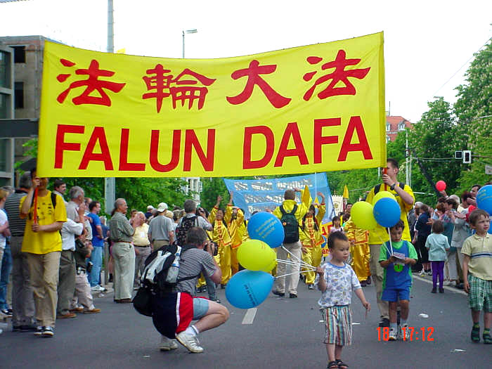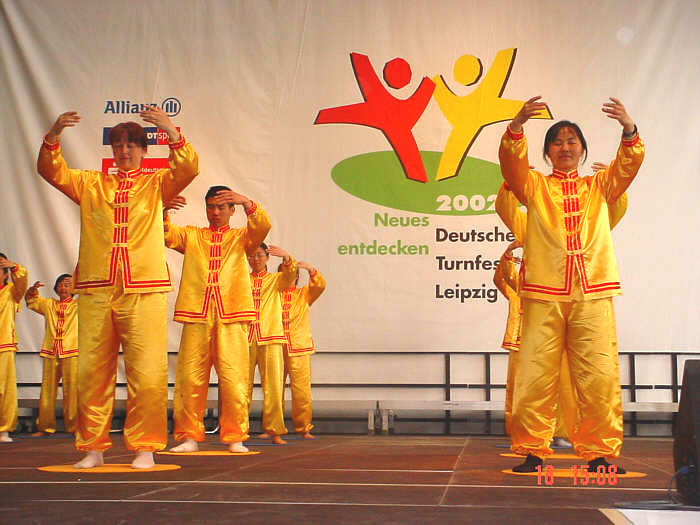 【明慧网2002年5月21日】三年一度的德国体操节今年五月十八至二十五日在德国东部体育名城莱比锡(Leipzig)举行。参加表演的是来自世界各地的体操团体。五月十八至十九日是最热闹的两天,法轮功学员应邀参加了今年的大型喜庆活动。这两天,来自世界及德国各地的约十万人参加了该节日的活动。
