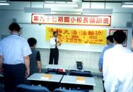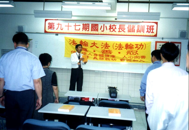 【明慧网2002年5月22日】2002年3月18日至5月10日,教育部的国民学校教师研习会举办了『第九十七期台湾区国小校长储训班』。研习期间,由辅导员侯校长倡议成立法轮功社团,受到热烈回响,来自全省的120位准校长们中有40位参与。
